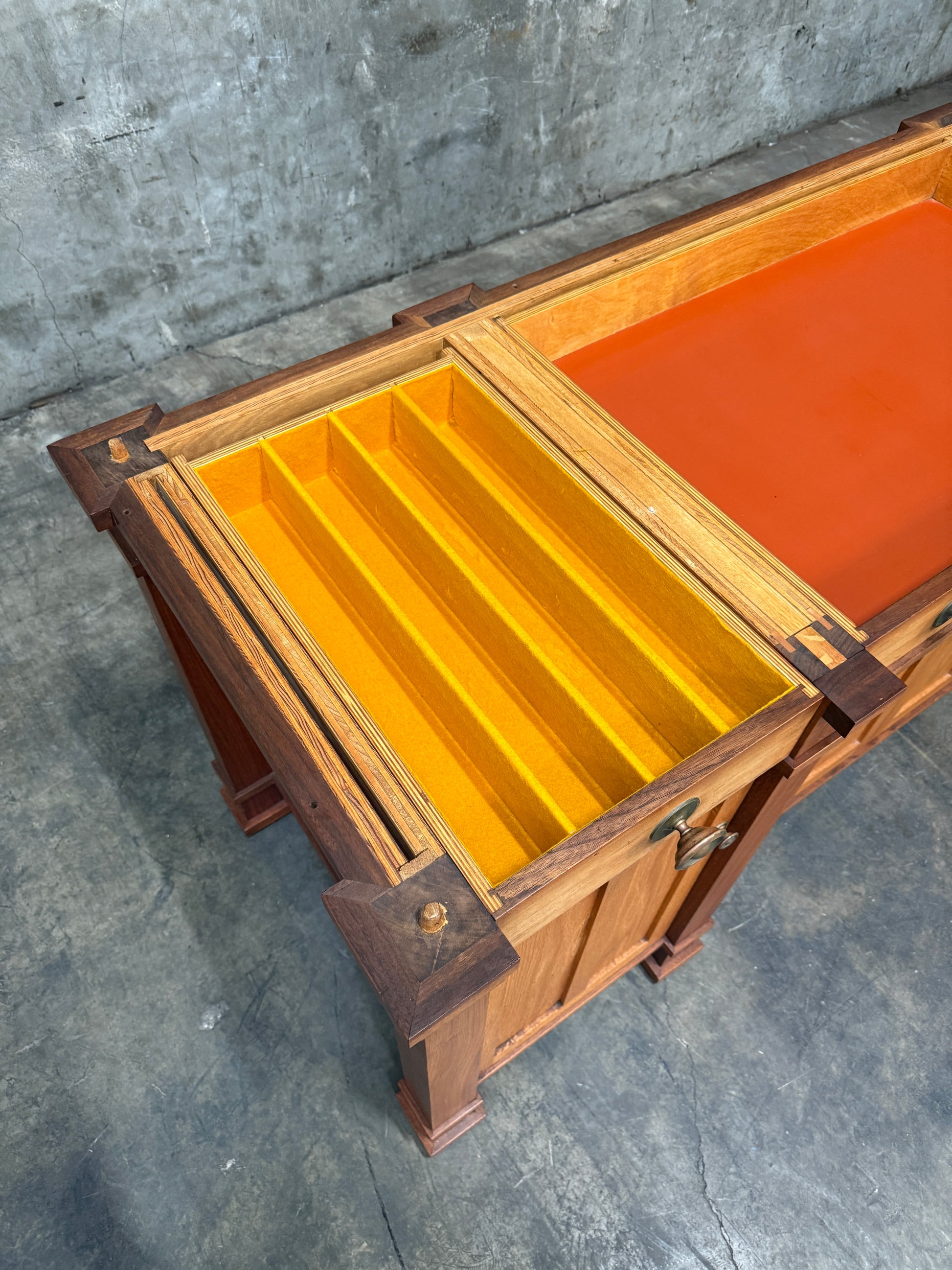The fold-out top expands from 24" to 44.75" deep, creating an extended surface ideal for serving or dining. Behind paneled doors lie precision-built drawers with lacquered orange faces and vibrant felt linings — details that reveal the artisan’s meticulous approach to both function and design.
