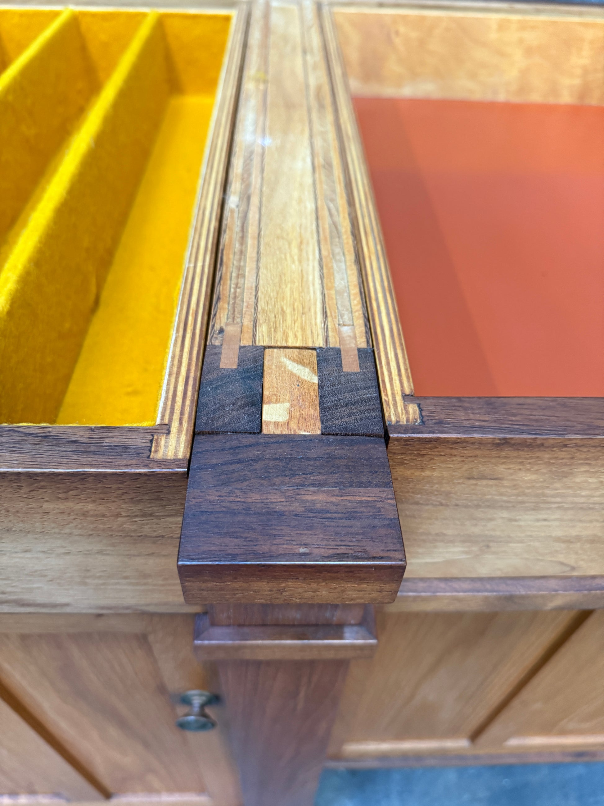Drawers with lacquered orange fronts and yellow felt lining