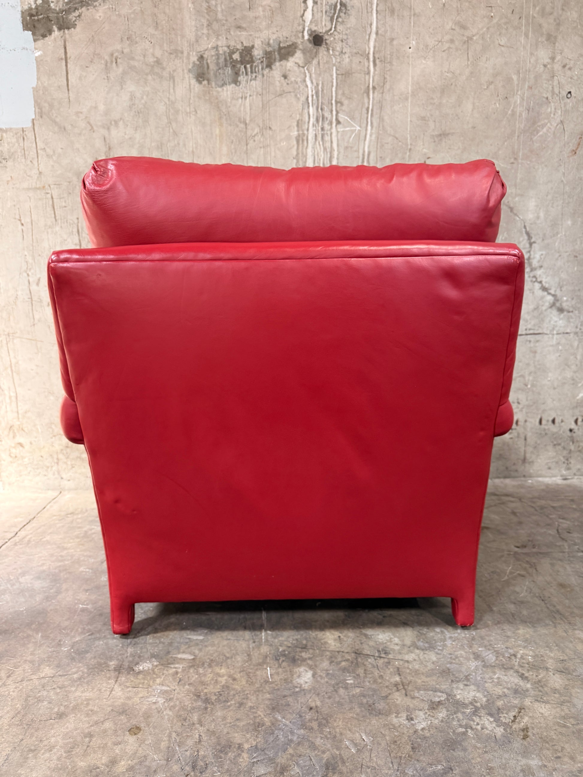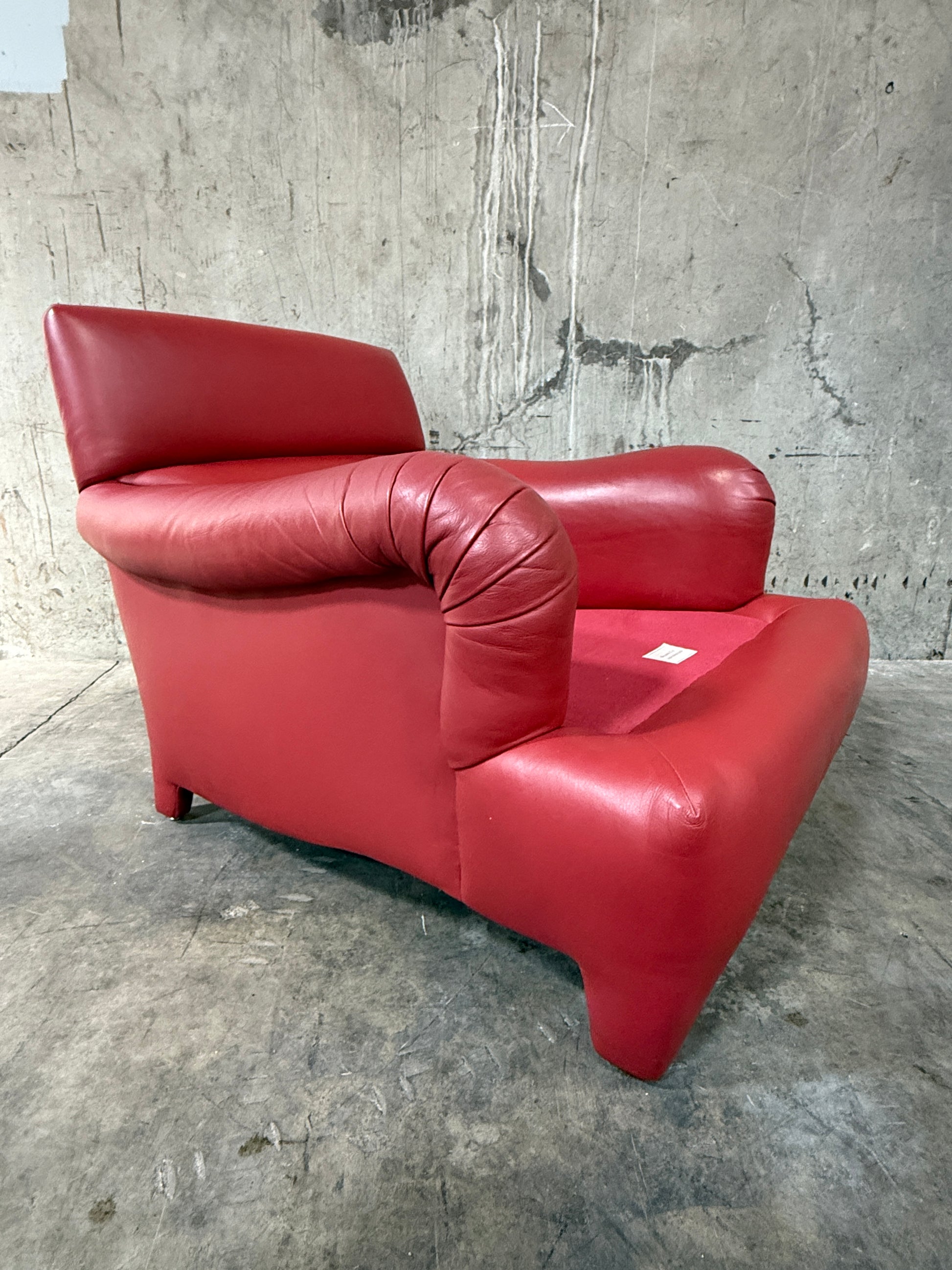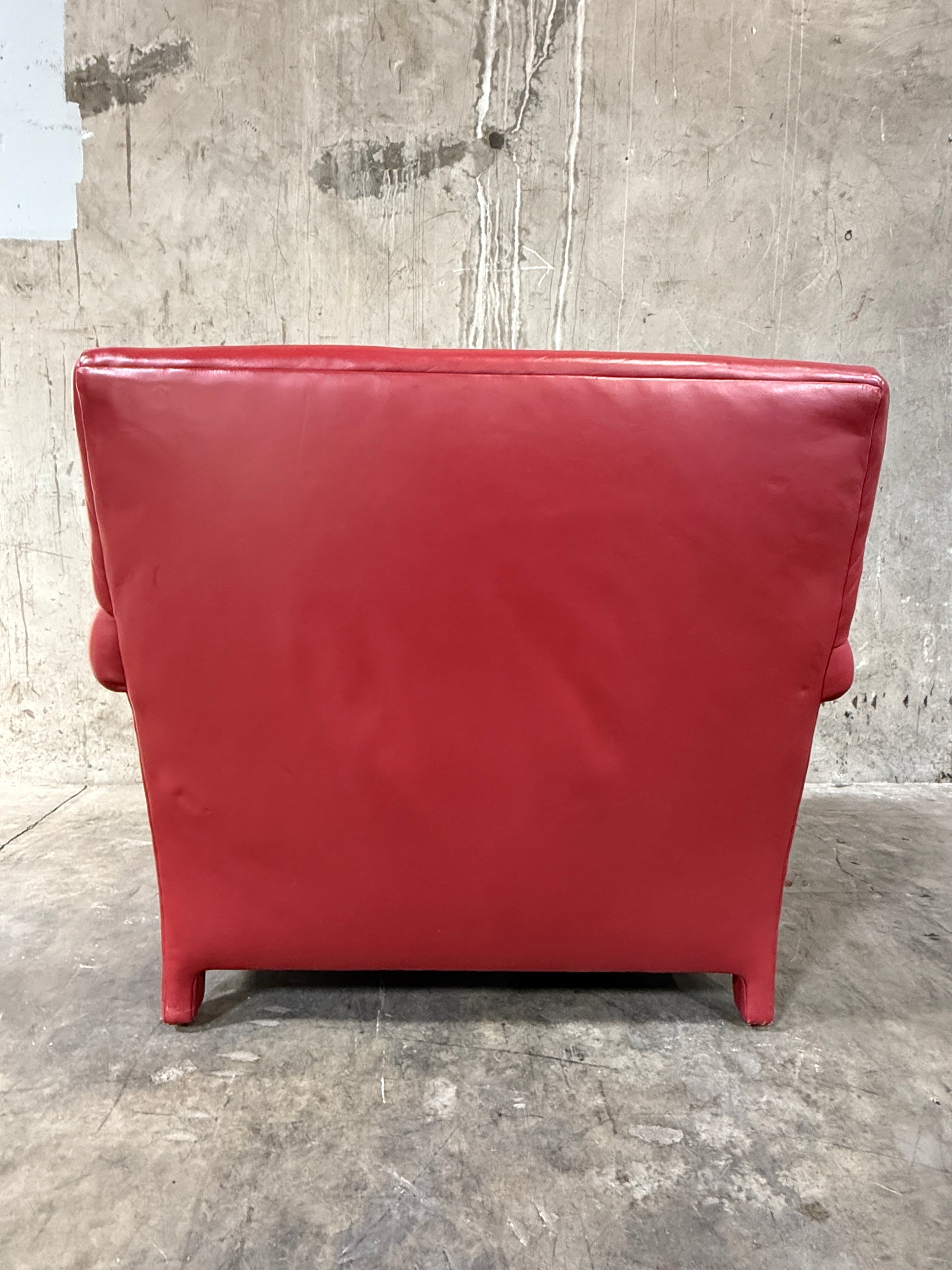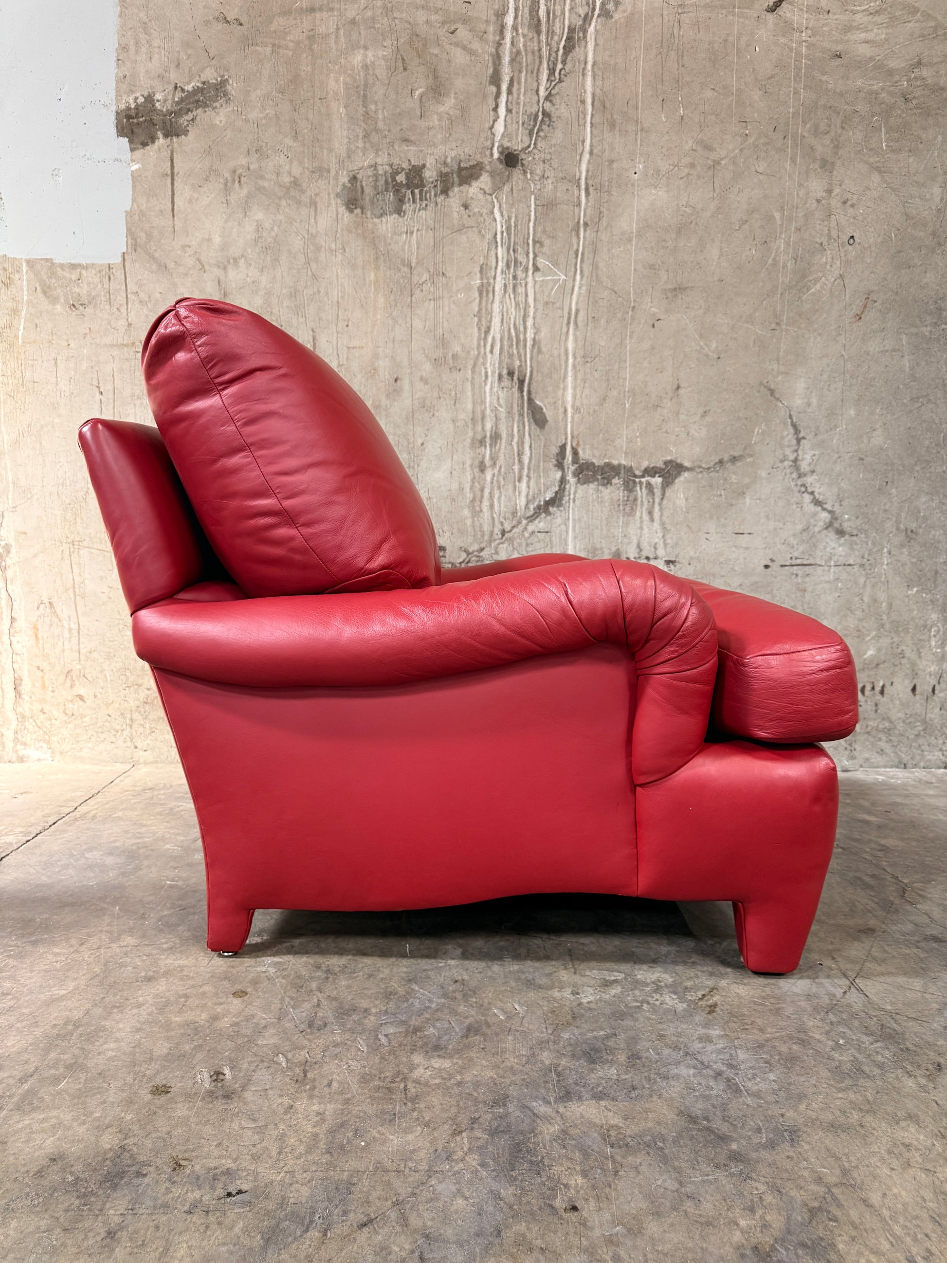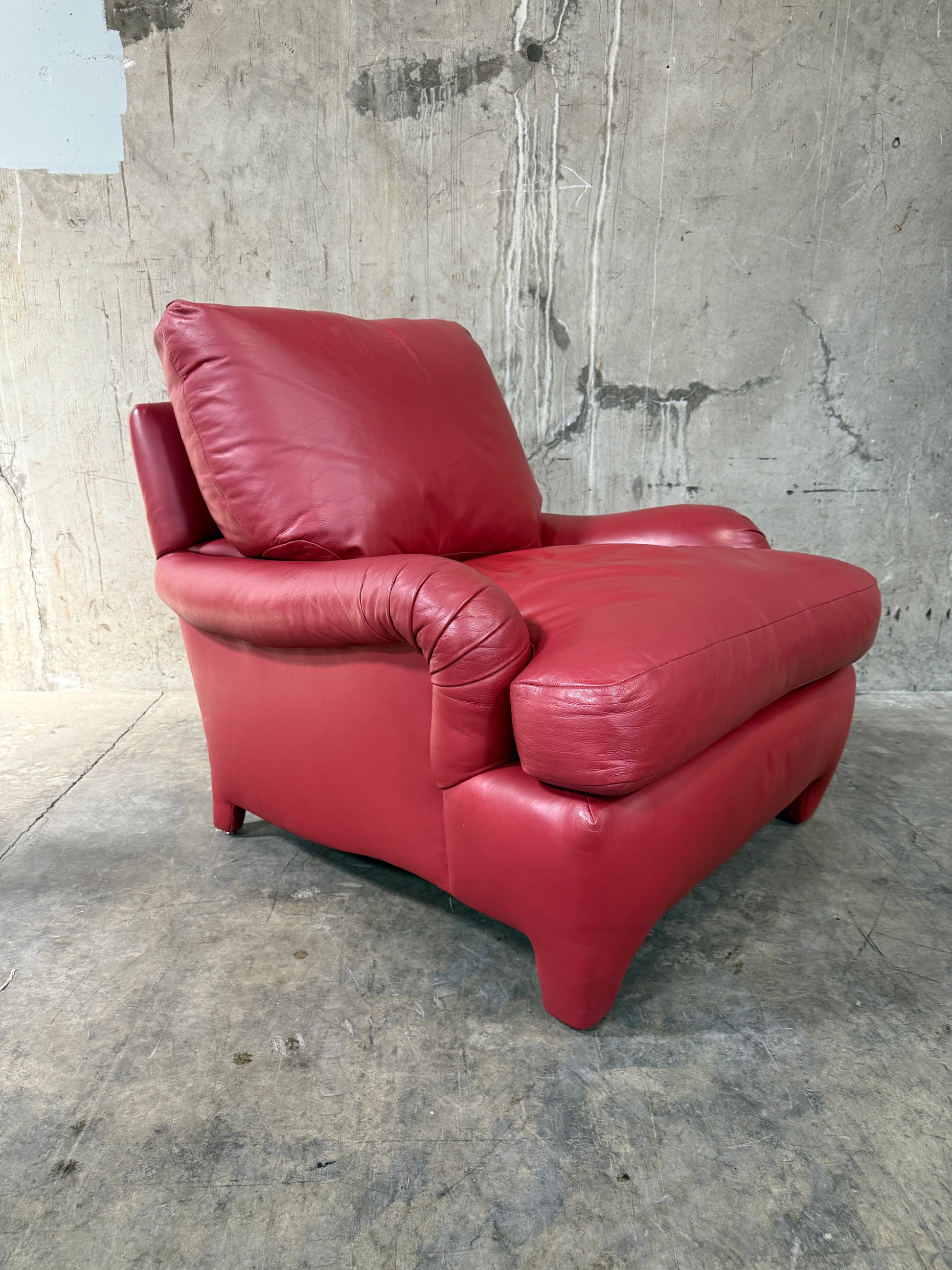 A striking vintage lounge chair and ottoman set from the 1970s by Michael Taylor, expertly refurbished by Belmar Co. San Francisco. Upholstered in supple red leather, this set offers both timeless design and comfort. The chair features deep seating with plush cushions, rounded armrests, and a sculptural silhouette, complemented by a generously sized ottoman for added relaxation. A statement piece that blends vintage style with modern usability. Designer: Michael Taylor Year: 1970s Refurbished by: Belmar Co., San Francisco Upholstery: Red leather Condition: Excellent refurbished condition Dimensions (Chair): Depth: 42” Width: 36” Height: 36” Arm Height: 22” Seat Height: 20” Seat Depth: 24” Dimensions (Ottoman): Height: 20” Width: 32” Depth: 24”