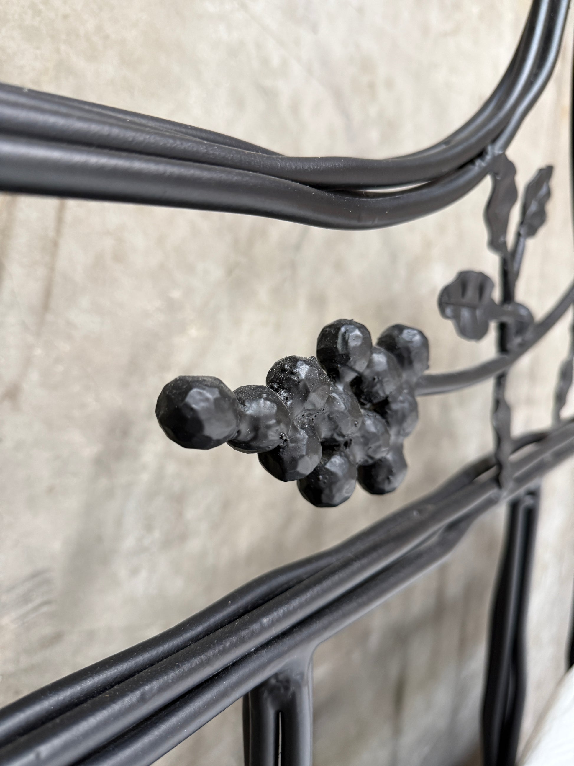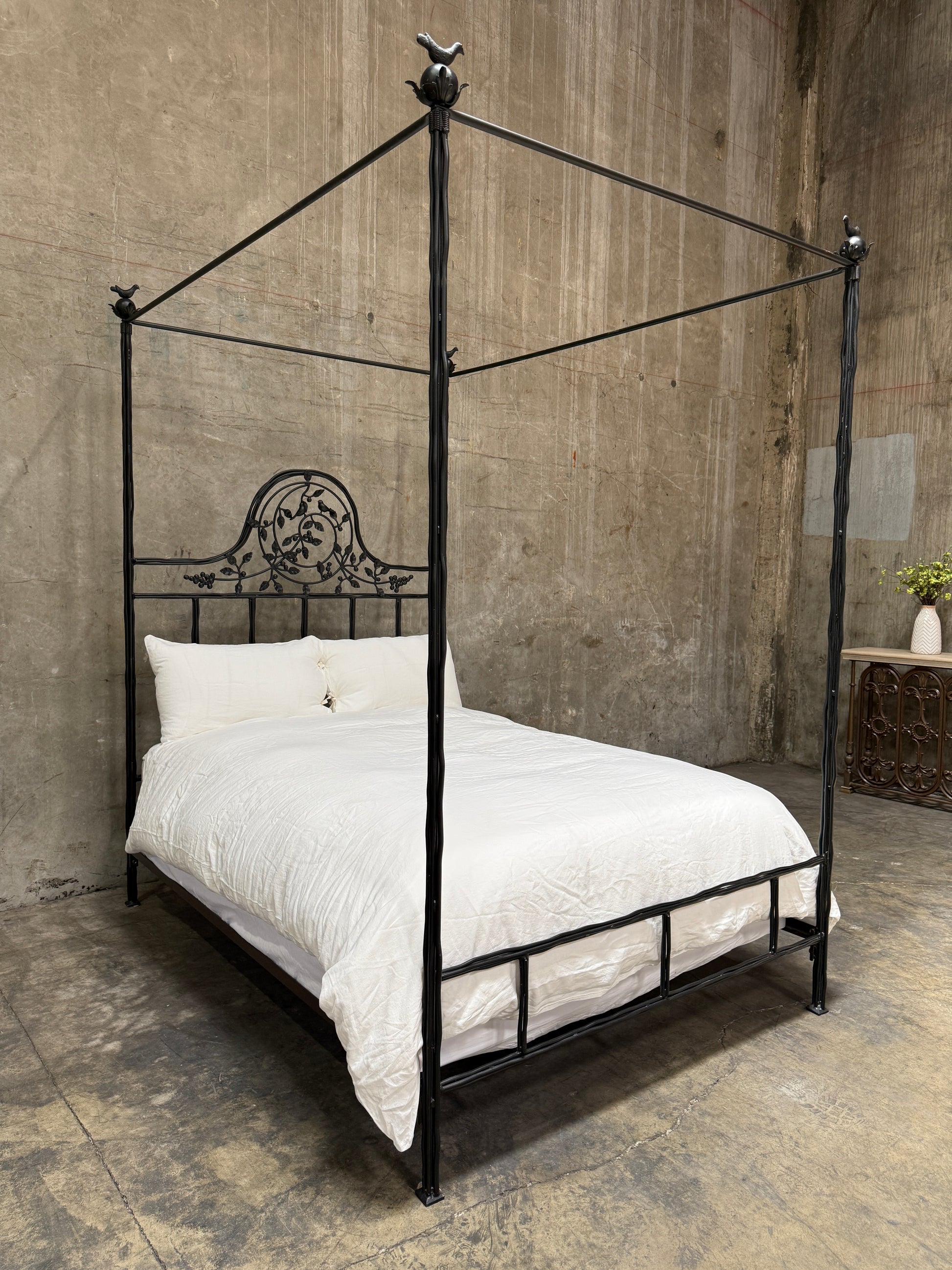 Elegant Corsican Iron Twiggy Canopy Bed in a queen size, featuring intricate twig and vine motifs on the headboard and charming bird-on-ball-with-leaf finials. This timeless design blends natural inspiration with the durability of wrought iron craftsmanship.