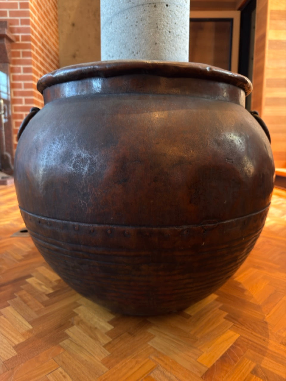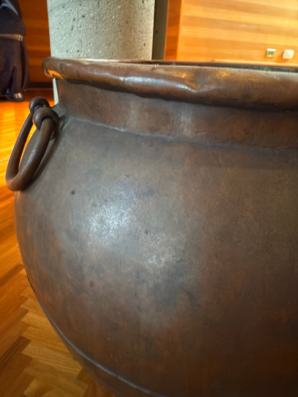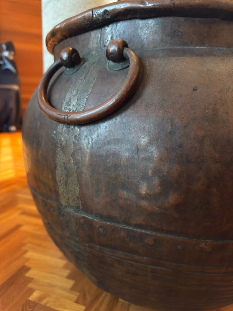 19th Century Hand Hammered Large Copper Water Vessel Riveted Ring Bands Handles