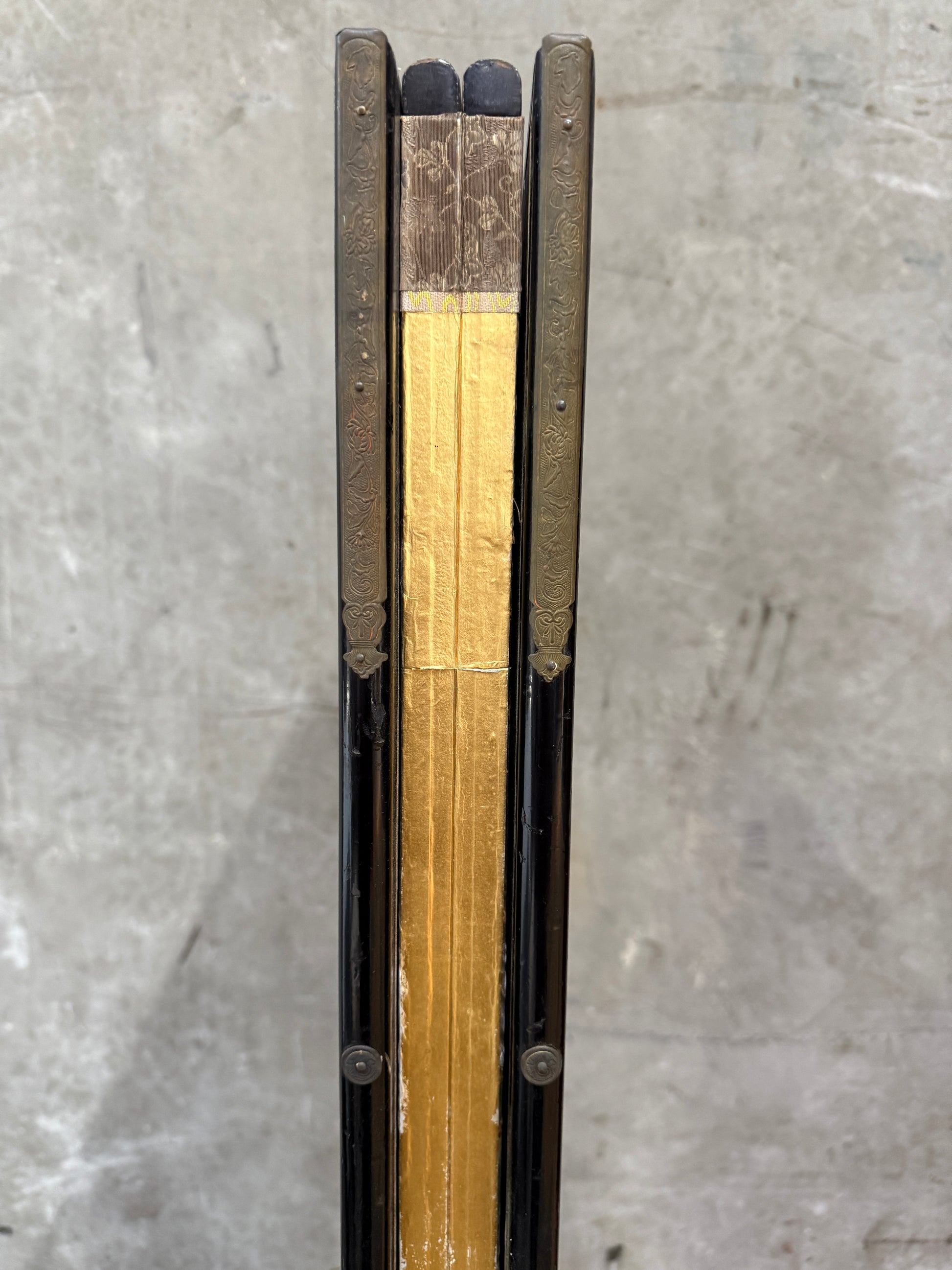 The screen retains its silk brocade border and engraved metal fittings, showcasing intricate floral motifs on the hardware. Dimensions are 67.5 inches high by 98 inches wide when fully extended.