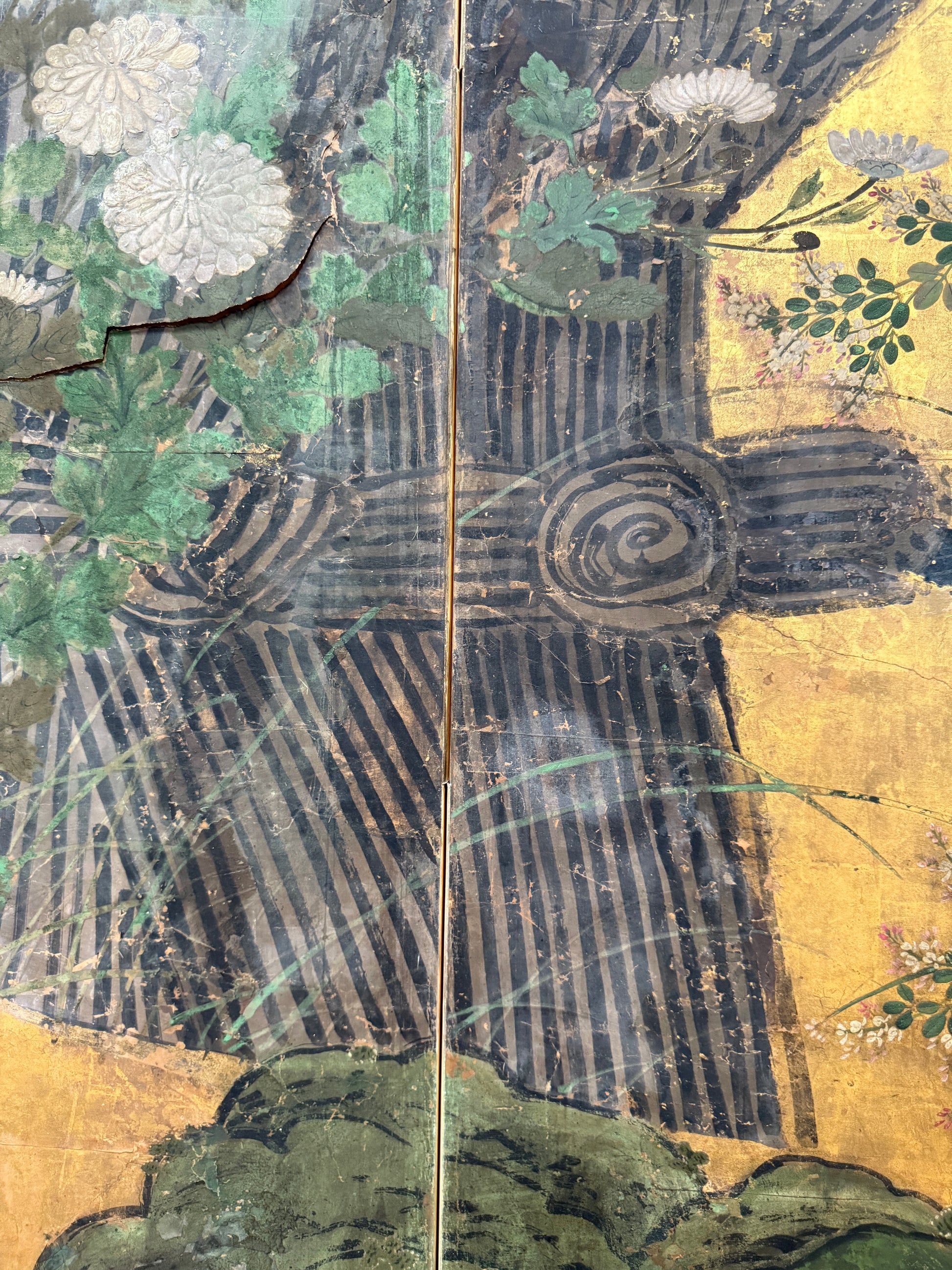 Japanese screen, Byōbu, Meiji period, antique folding screen, Japanese gilt screen, chrysanthemum painting, morning glory Japanese art, 19th century Japanese, Asian antiques, decorative screen