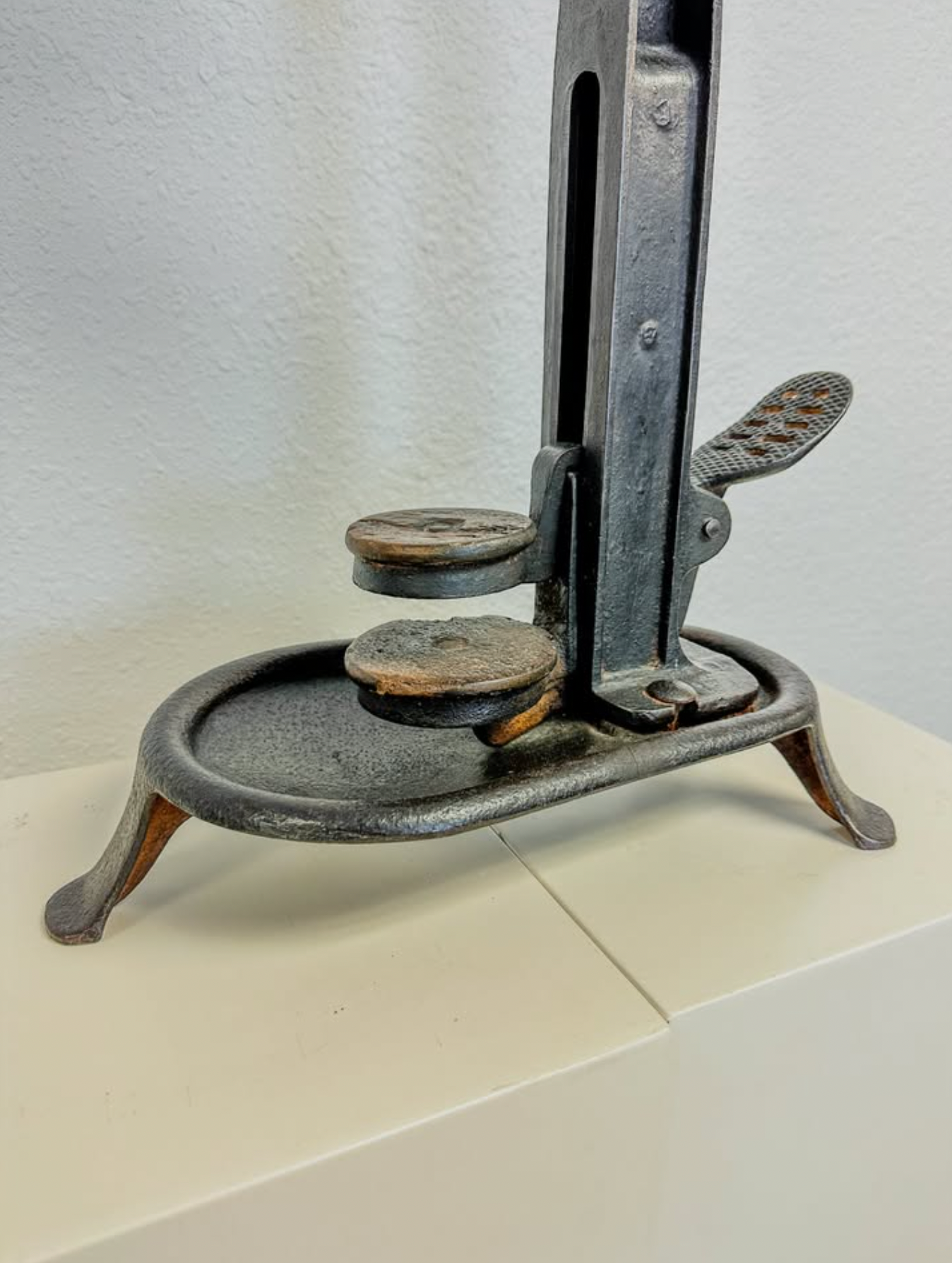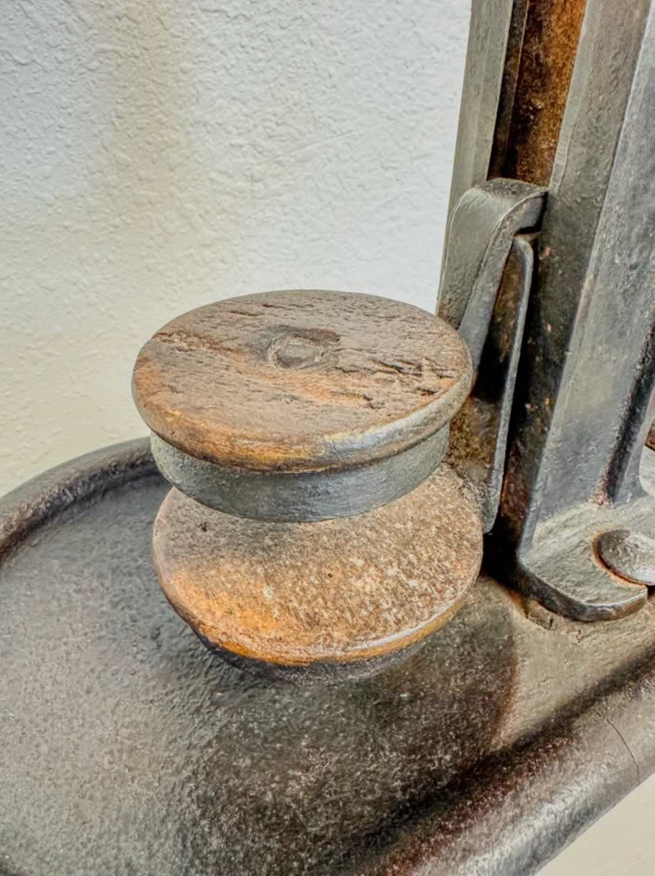 Add a touch of authentic French provincial charm and winemaking history to your home with this stunning antique cast iron wine bottle corker! Standing approximately 36 inches tall, this substantial piece makes a fantastic decorative statement in a kitchen, dining room, wine cellar, bar area, or as a unique accent in any rustic or industrial-themed decor.