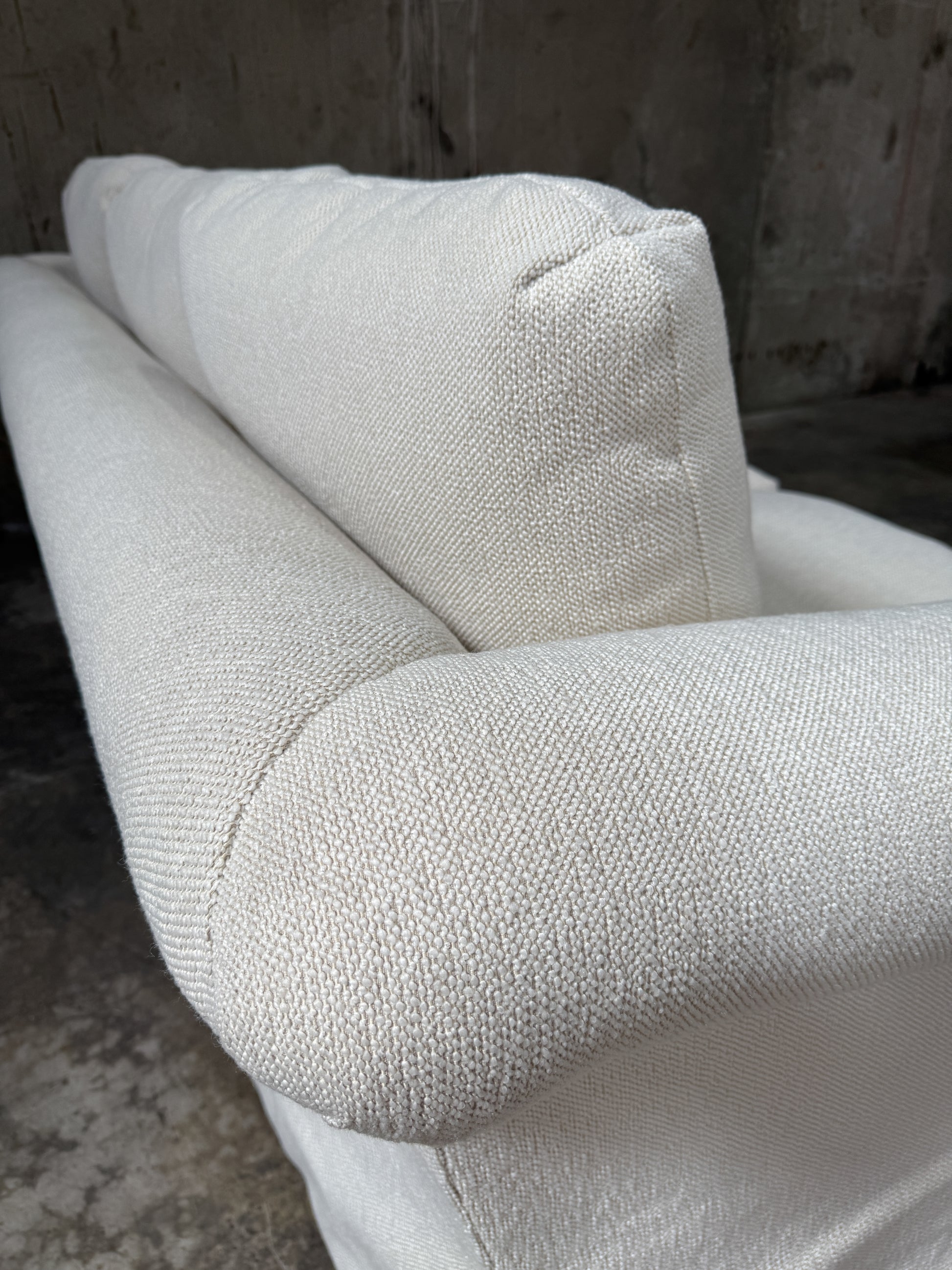 Beautiful custom designer-sourced sofa, upholstered in a soft textured white fabric with a classic rolled-arm silhouette and tailored skirted base. Built with premium craftsmanship and a sturdy frame, this sofa is both timeless and versatile — equally at home in modern, transitional, or traditional interiors.