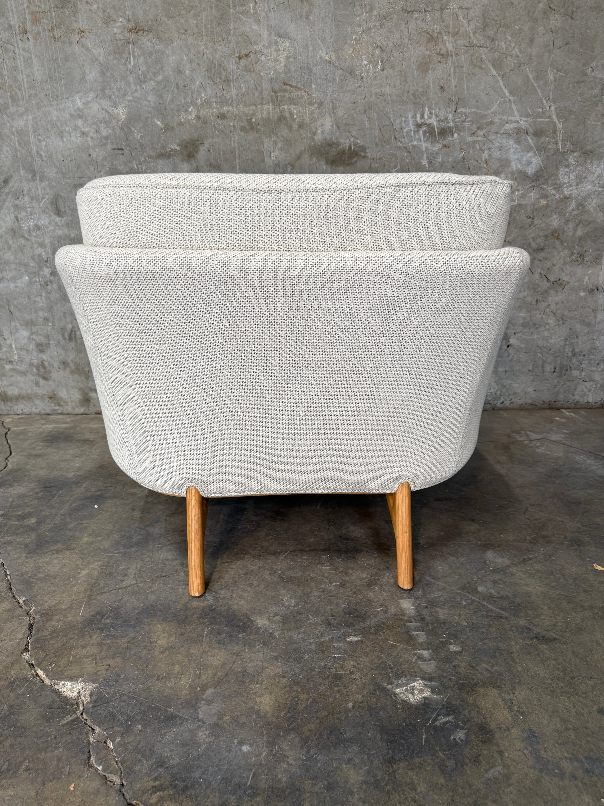 This Stanley Armchair features a comfortable, inviting form upholstered in a high-quality, textured light neutral fabric (as seen in photos). The exposed frame and legs are crafted from beautiful Danish oiled oak timber, showcasing its natural grain and warm tones. Its elegant silhouette and exceptional comfort make it perfect for a living room, study, or sophisticated lounge area.