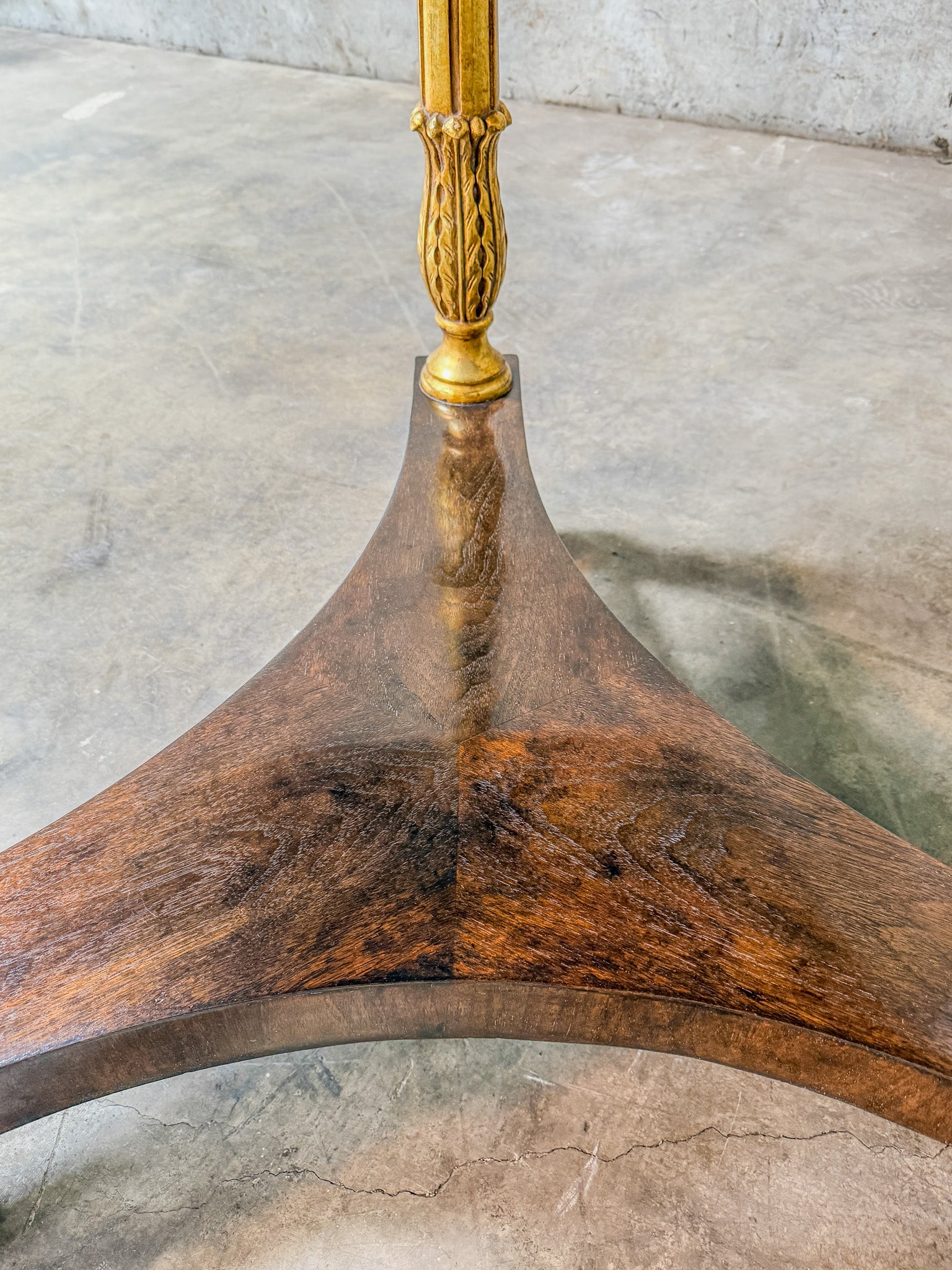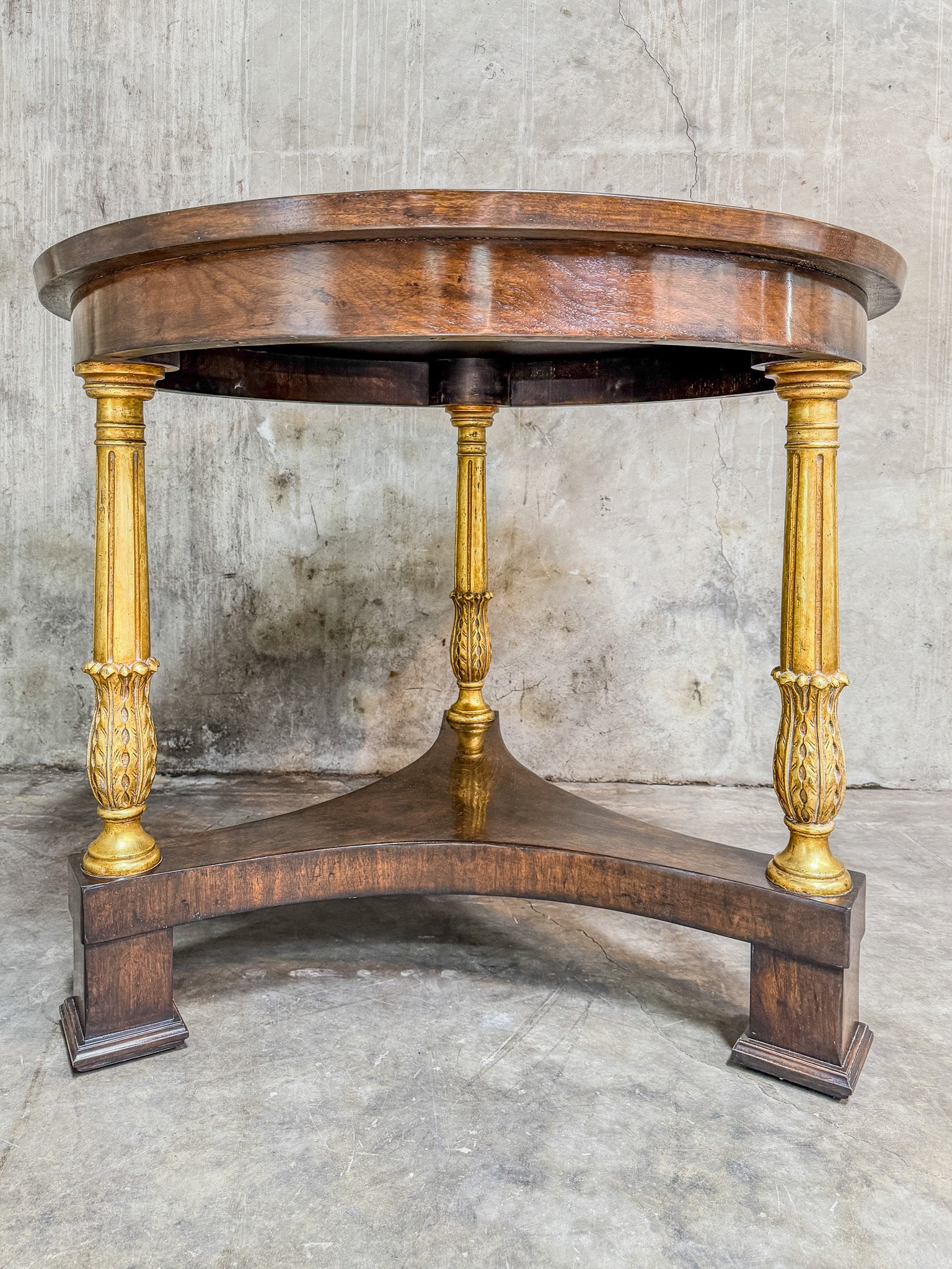 This gallery table features a meticulously hand-planed and French polished walnut top, showcasing a stunning banded sunburst pattern that draws the eye. The elegant base is adorned with hand-carved and fluted decorative legs, presented in a breathtaking antiqued 22K Gold finish that adds a regal touch to its classical design. Perfect as a grand accent table in an entryway, a sophisticated side table in a living room, or a functional piece in a study.