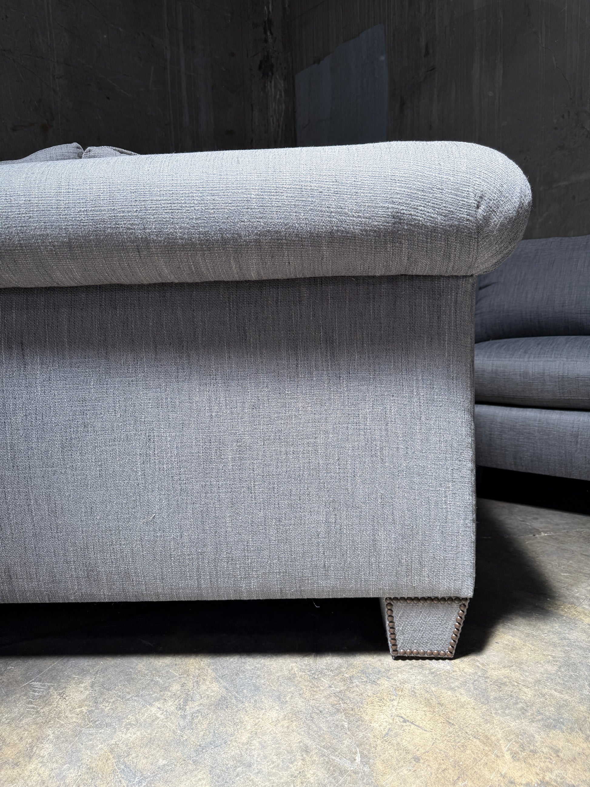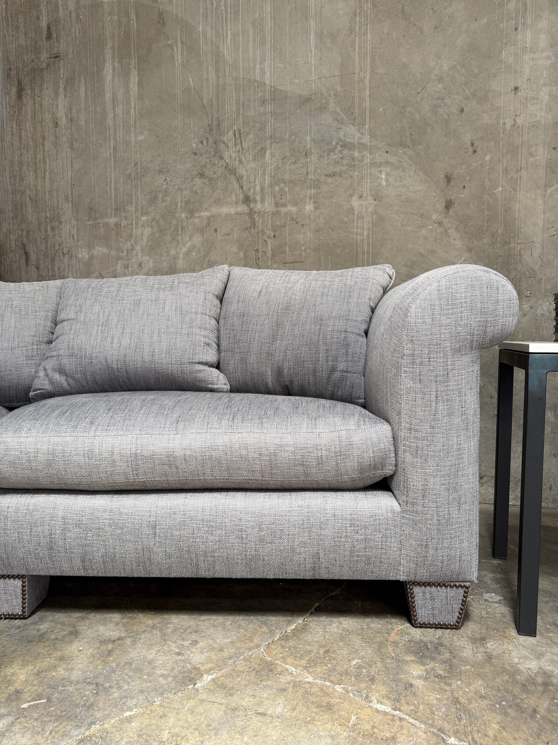 Elegant custom gray slate sectional sofa, featuring deep cushions with down filling, rolled arms, and subtle nailhead trim. Upholstered in a durable woven fabric, this piece combines timeless style with modern comfort.