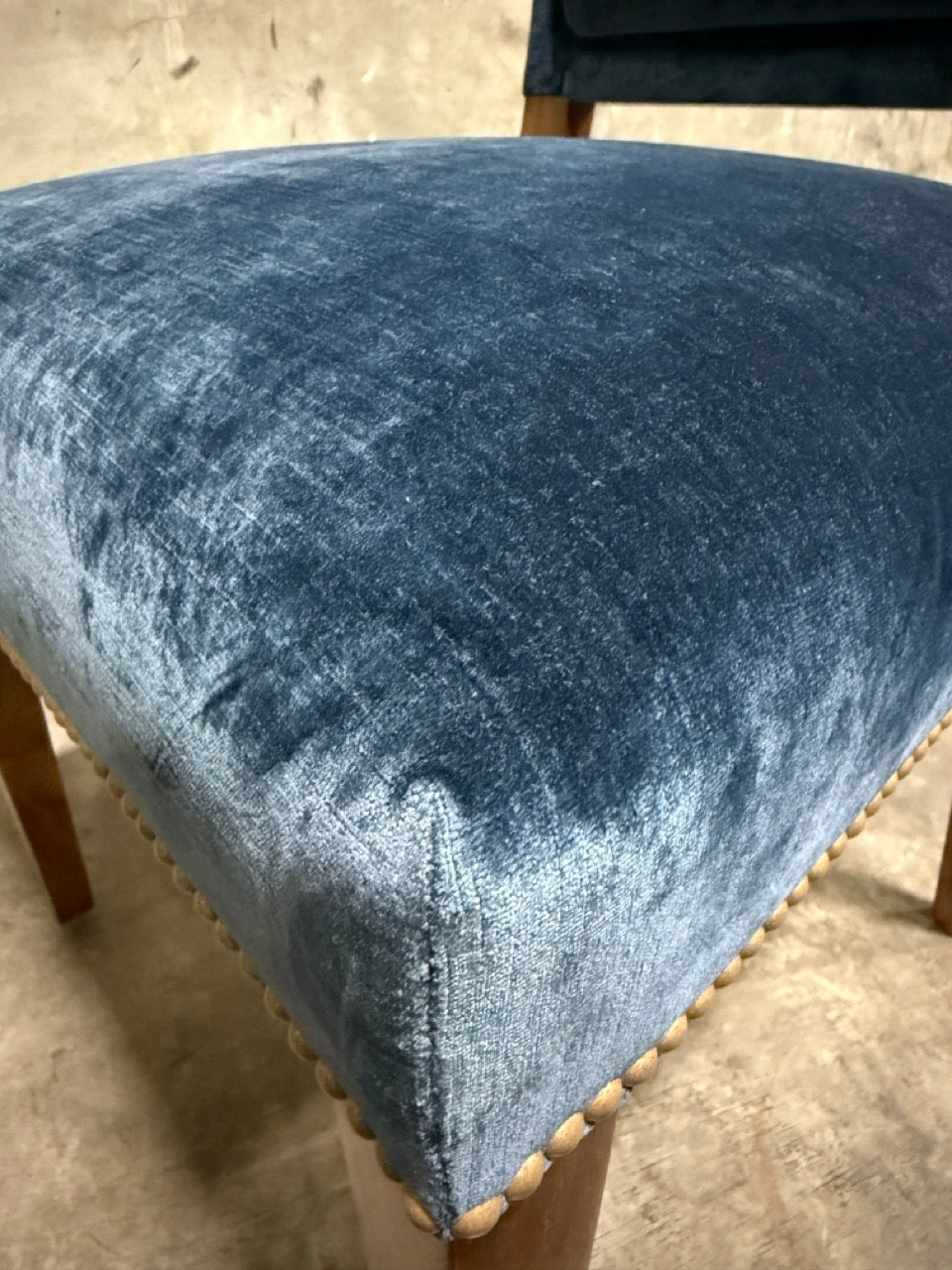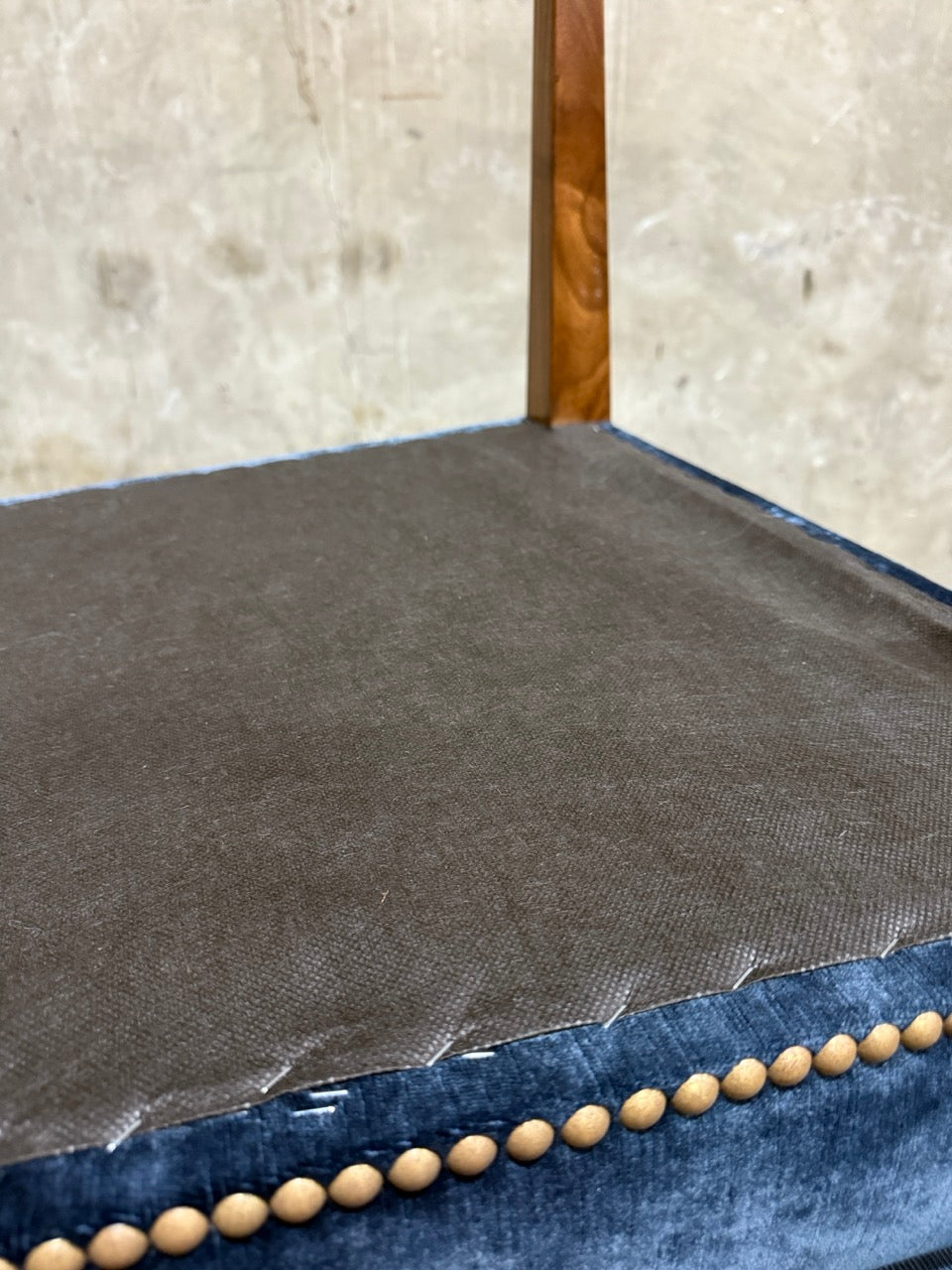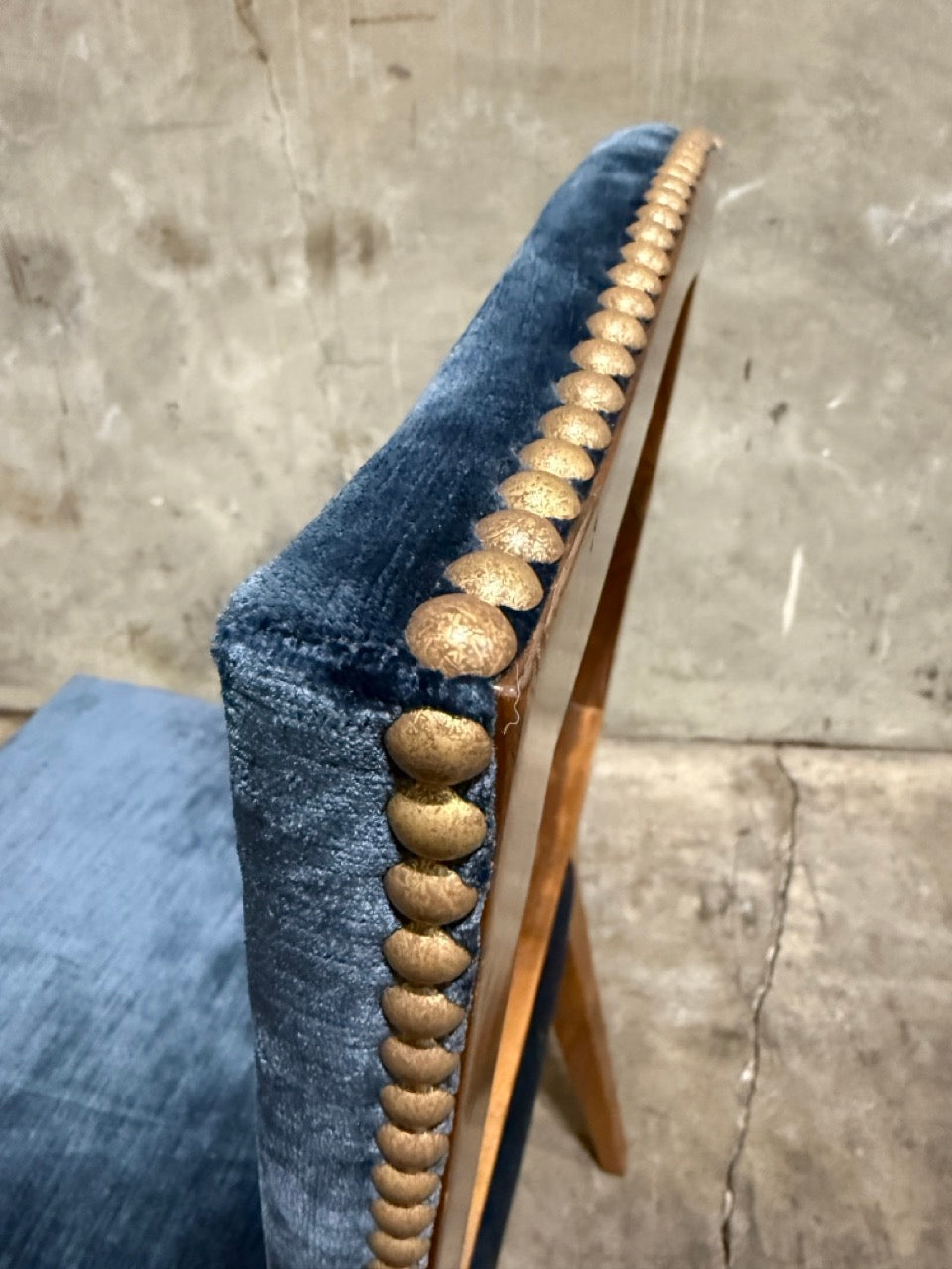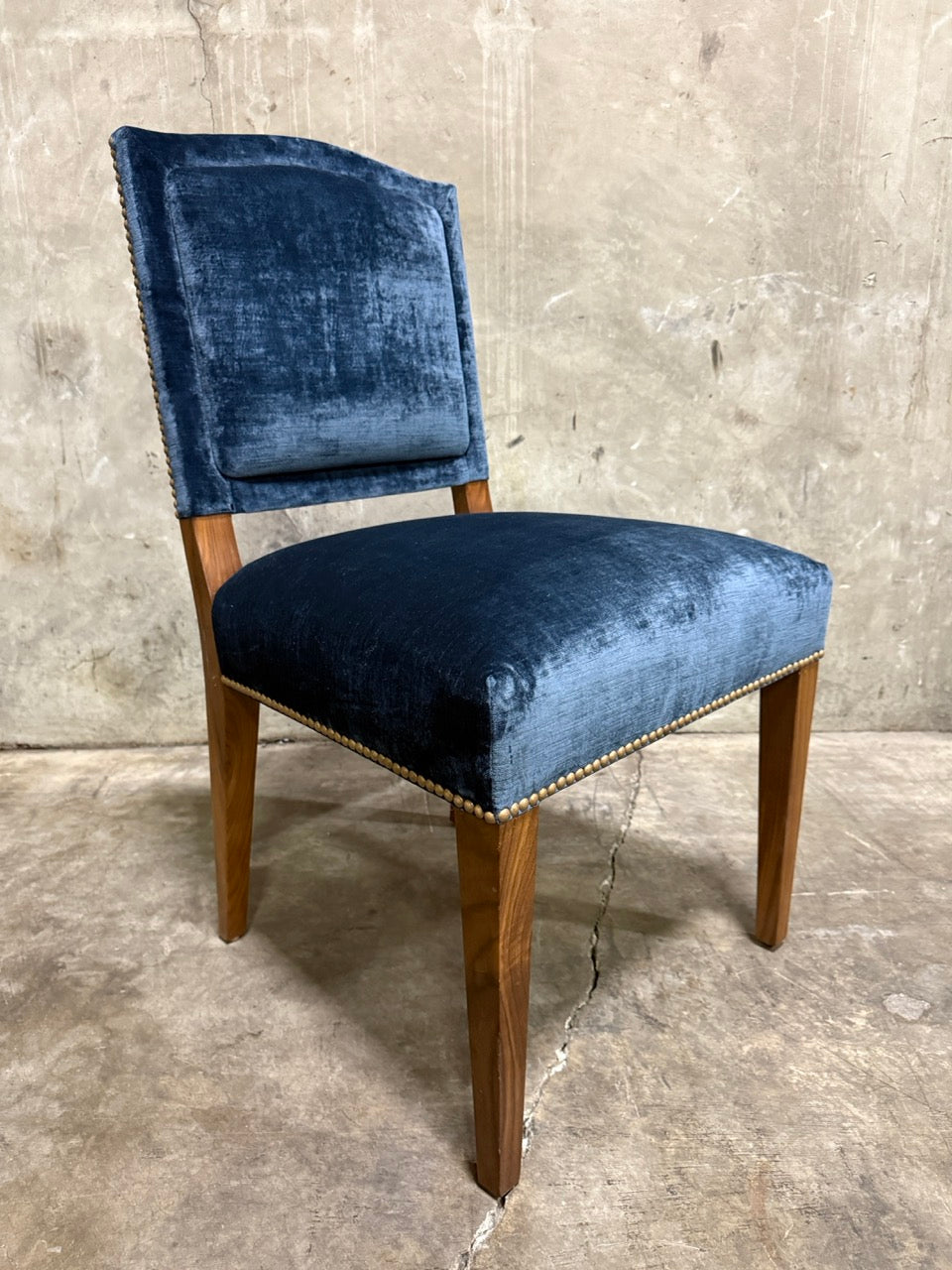 Each chair features a handcrafted walnut frame with elegant tapered legs, upholstered in deep blue cut velvet and finished with antique brass nailhead trim. The design balances classic refinement with modern California craftsmanship — a hallmark of Michael S. Smith’s timeless aesthetic.