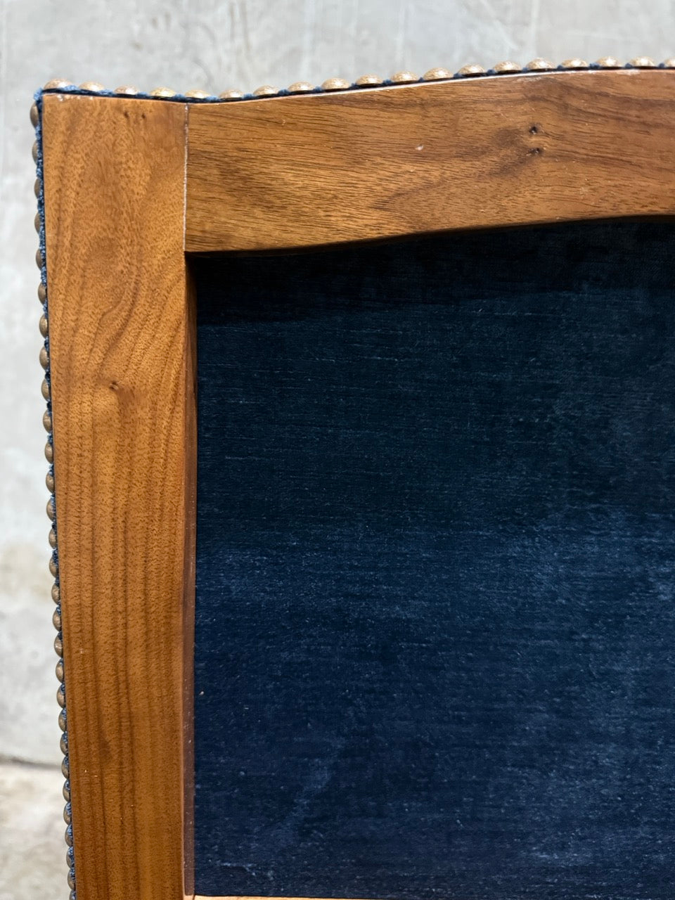 Materials: Solid walnut, velvet upholstery, brass nailhead trim