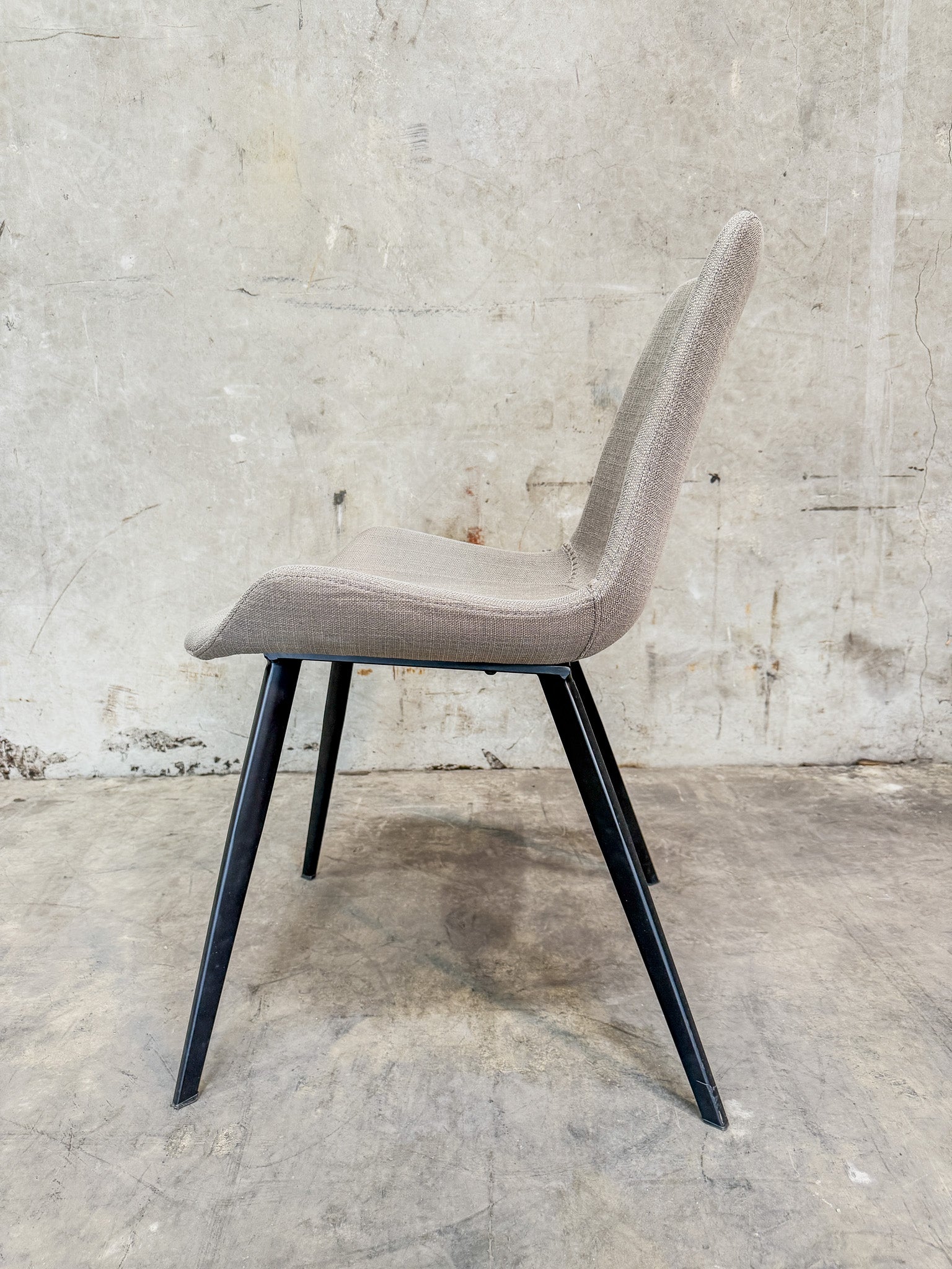 Each chair features a beautifully upholstered seat and back in a contemporary gray fabric with a subtle, elegant greenish/gray hue, adding a unique depth that shifts with the light. The sleek, tapered legs ensure stability and complement the modern aesthetic.
