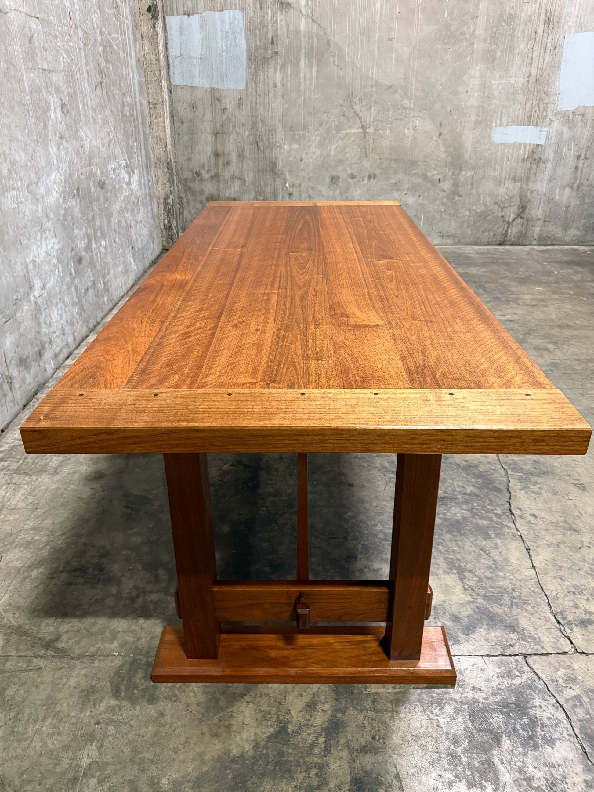 Designed as a statement piece for elevated dining or creative workspaces, the table features a beautifully grained walnut top with visible joinery pins, a sculptural trestle base, and pegged mortise-and-tenon details. A refined mix of modern craft and timeless simplicity.