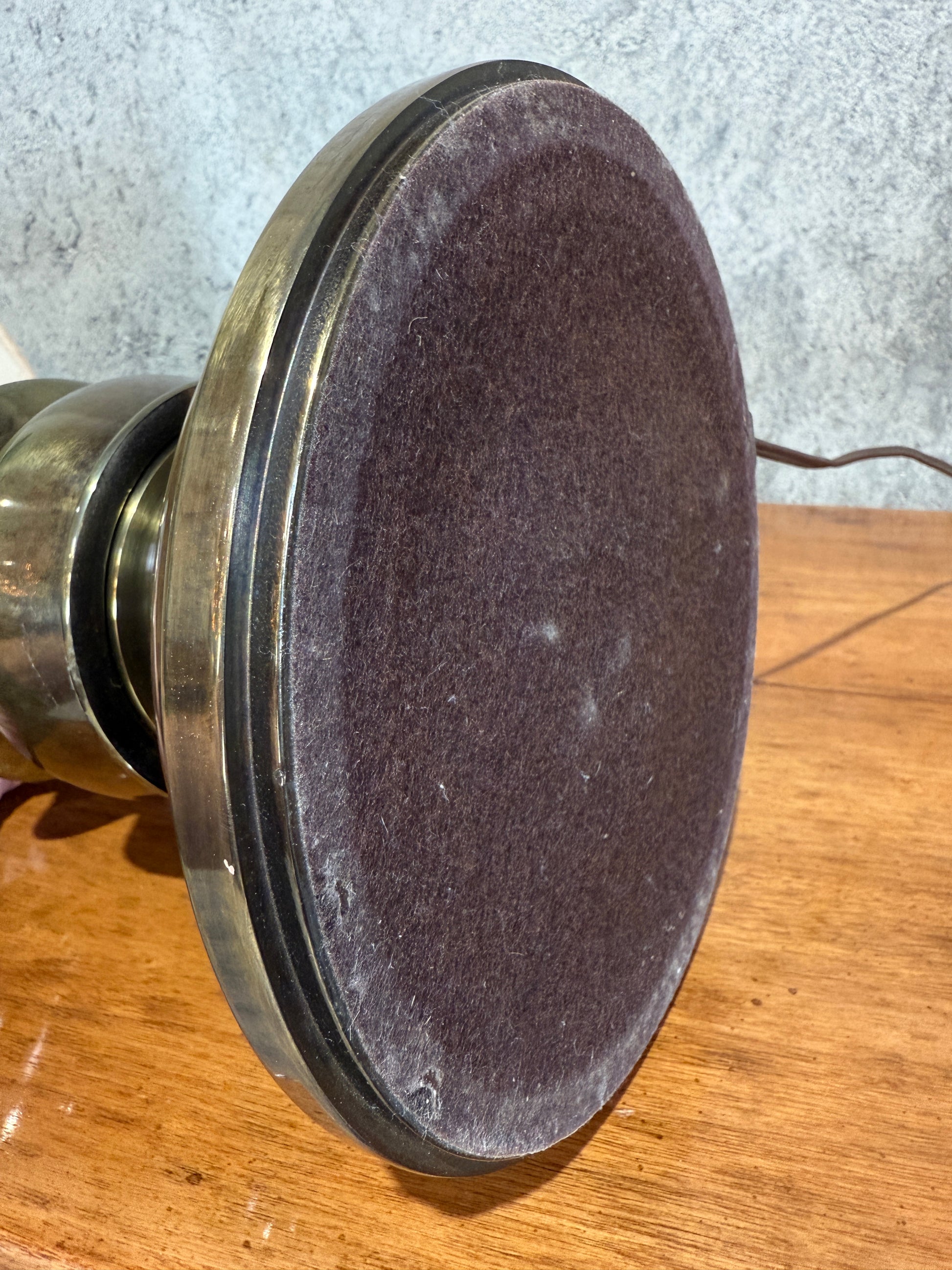 An elegant vintage brass table lamp. Features a sturdy brass base and a neutral linen shade. This piece offers a warm and inviting glow for any room. In excellent condition and fully functional.
